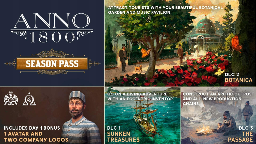 Anno 1800 - Season Pass 1 to pierwszy pakiet rozszerzeń do kultowego city-buildera. Otrzymasz trzy duże DLC: Sunken Treasures, Botanica i The Passage, które dodają nowe regiony, mechaniki i wyzwania. Eksploruj Arktykę, buduj ogrody botaniczne i nurkuj po zatopione skarby. Dziesiątki godzin dodatkowej rozgrywki i nowe możliwości rozwoju imperium!