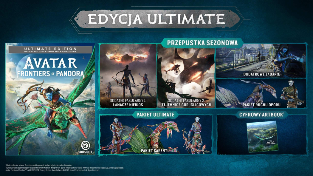 Avatar: Frontiers of Pandora Ultimate Edition to najpełniejsza wersja gry akcji FPP w świecie Pandory. Pakiet zawiera grę podstawową, Season Pass z dwoma fabularnym DLC oraz ekskluzywne bonusy: Zestaw Potomka Sarentu z unikalną bronią i strojem. Wciel się w Na'vi, eksploruj zachodni kontynent i walcz z RDA przy użyciu wyjątkowego wyposażenia. Ultimate Edition to kompletne doświadczenie z dodatkowymi treściami, oszałamiającą grafiką i epicką przygodą na Pandorze.